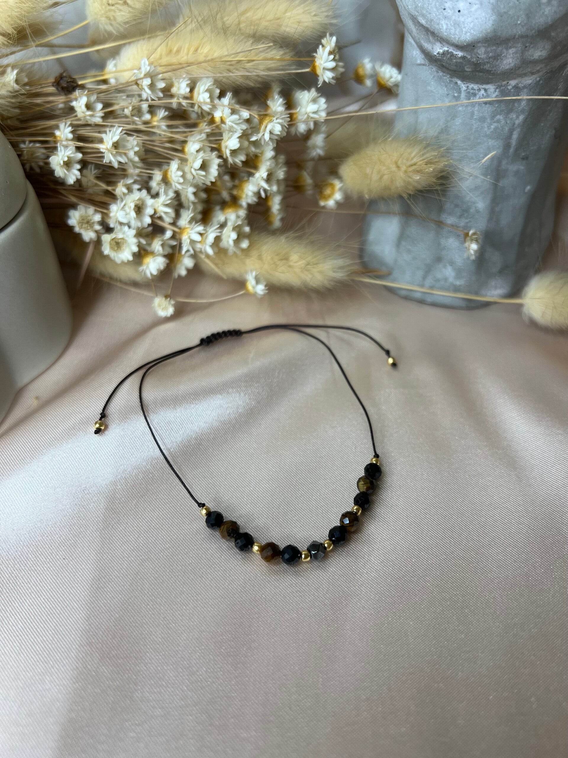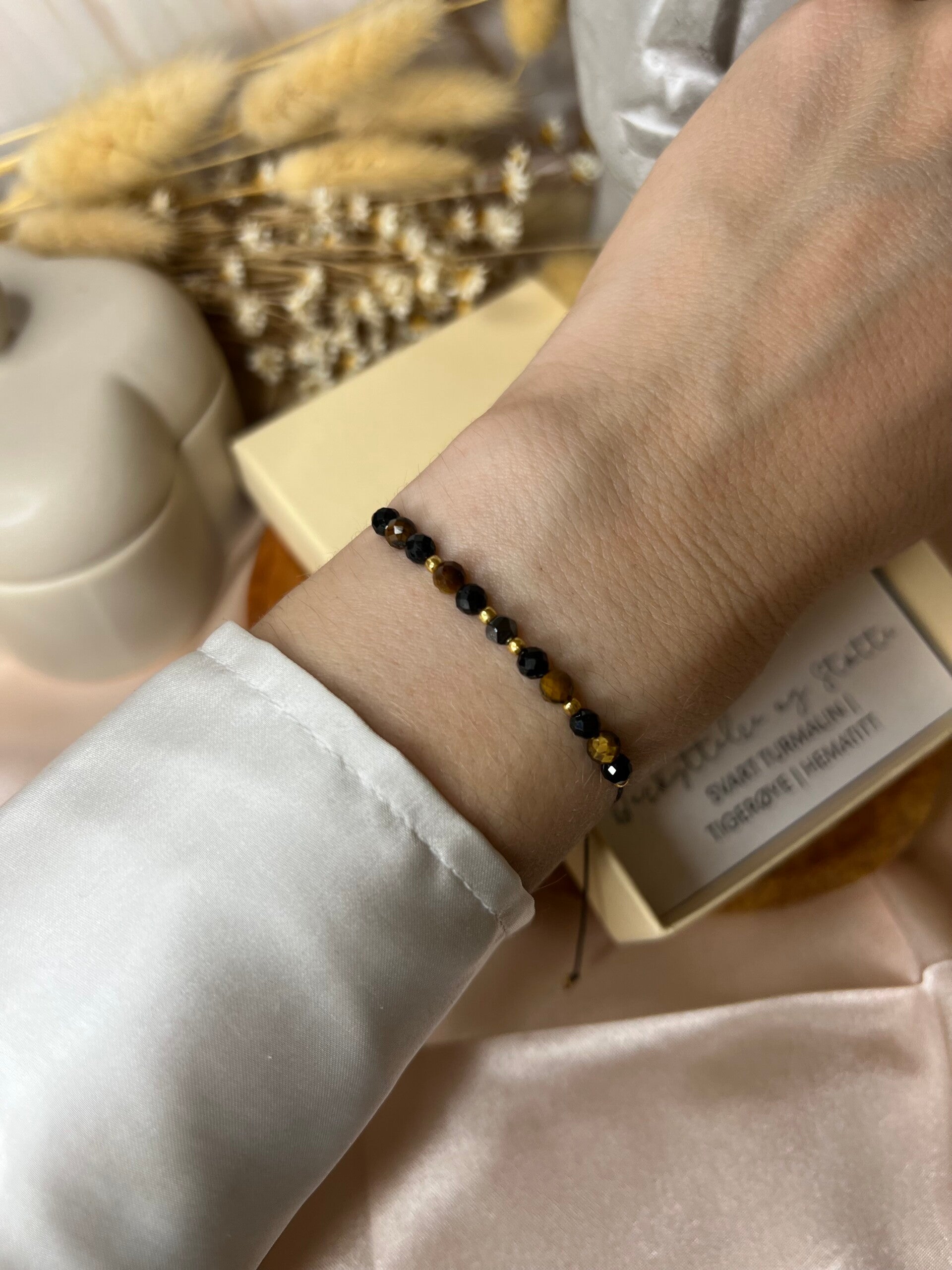 Armbånd for intensjonen Beskyttelse og Støtte. Laget av svart turmalin, tigerøye og hematitt, kombinert med gyldne glassperler for et elegant uttrykk.