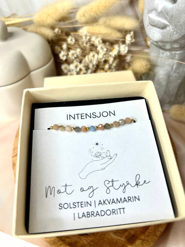 Armbånd for intensjonen Mot og Styrke. Laget av solstein, akvamarin og labradoritt, med gyldne glassperler som fremhever steinenes naturlige glød.